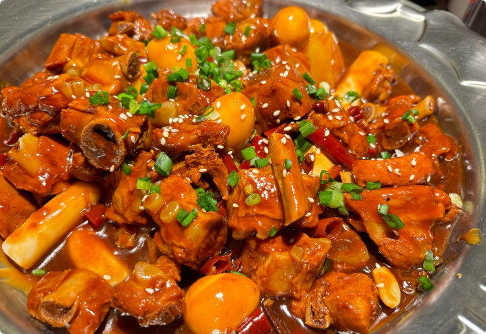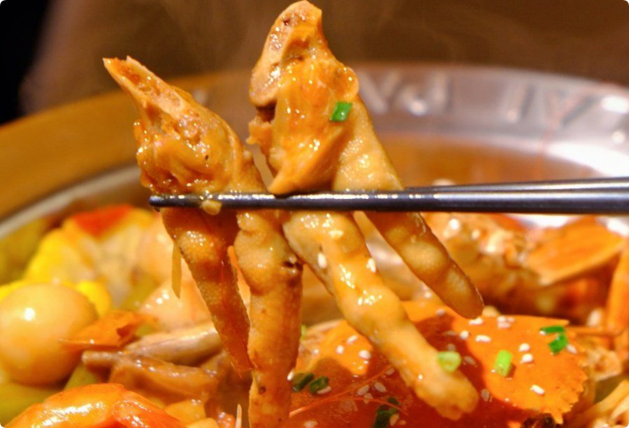 秘制口感:肉蟹與雞爪子、豆腐、年糕兒、水果玉米一起烹制。